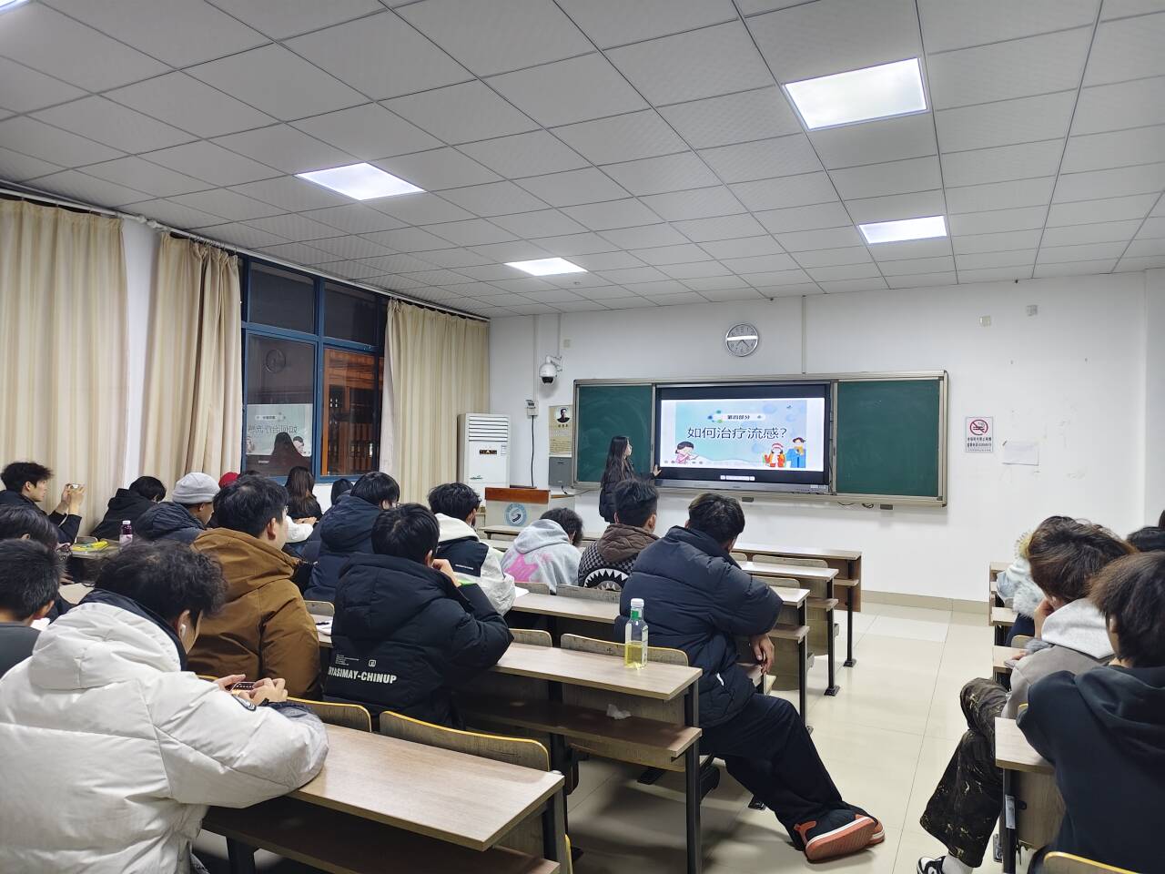 随后,李莫冉向全班同学系统讲解了流感的定义、典型症状、传播途径、治疗原则等关键知识,重点围绕“科学预防”展开详细阐述,从日常个人卫生防护(如勤洗手、正确佩戴口罩)、生活习惯养成(如规律作息、均衡饮食、适度锻炼)、环境通风消毒,到流感疫苗接种等方面,给出了具体可操作的建议,帮助同学们构建起全方位的流感防护体系。