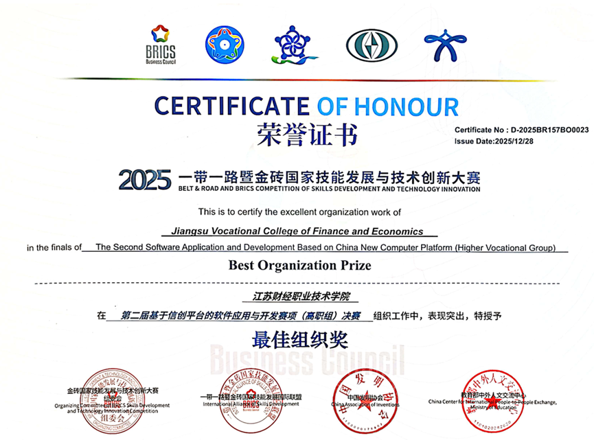 12月26日至28日,由金砖国家工商理事会中方理事会、“一带一路”暨金砖国家技能发展国际联盟等权威机构联合主办的2025年“一带一路”暨金砖国家技能发展与技术创新大赛——第二届基于信创平台的软件应用与开发赛项总决赛在苏州工业园区工业技术学校落下帷幕,本次赛事共吸引全国104所院校的223名选手参赛。智能工程技术学院24物联网班刘柳、李杨雪同学在冯辉、陆铁文两位老师的精心指导下,凭借过硬的专业素养和出色的临场表现,分别斩获国赛一等奖和优秀奖。学校因在赛事组织协调工作中表现突出,荣获赛项“最佳组织奖”,指导教师冯辉也获评“优秀指导教师”称号,充分彰显了我校在信创领域技术技能人才培养的扎实成效与鲜明特色。