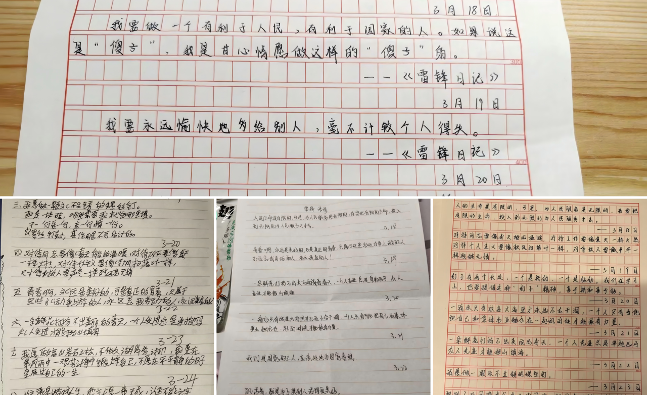 本次班级活动以“雷锋精神润心田,摘抄打卡传新风”为主题,明确制定打卡要求:全体同学每日摘抄1条雷锋语录,以笔记本、便签、信纸等为书写载体,做到书写工整、内容完整,并在摘抄内容右下角规范标注打卡日期。活动期间,班级同学全员参与、认真践行,纷纷拿起纸笔,用心摘抄“一滴水只有放进大海里才永远不会干涸”“我愿做一颗永不生锈的螺丝钉”等经典雷锋语录。在一笔一划的书写中,同学们重温雷锋同志的初心与坚守,沉浸式感悟其无私奉献、爱岗敬业、团结互助的精神品质,让雷锋精神在笔尖流淌、在心中扎根。