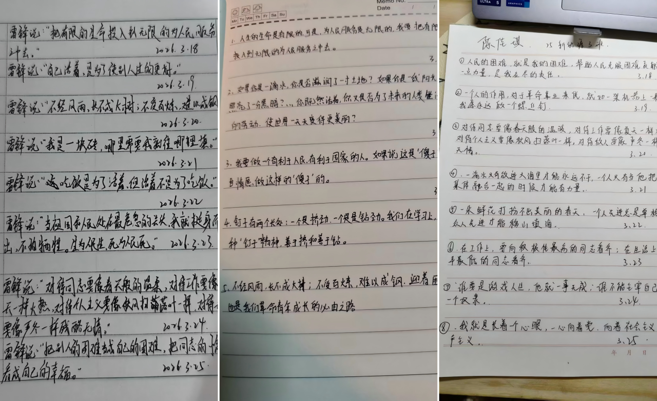 为深入传承雷锋精神,弘扬时代文明新风,引导班级全体同学在笔墨间感悟雷锋精神的时代内涵,厚植爱国情怀与道德素养,丰富班级文化生活,25新能源汽车技术3班于3月18日至25日开展“雷锋语录”摘抄打卡活动。
