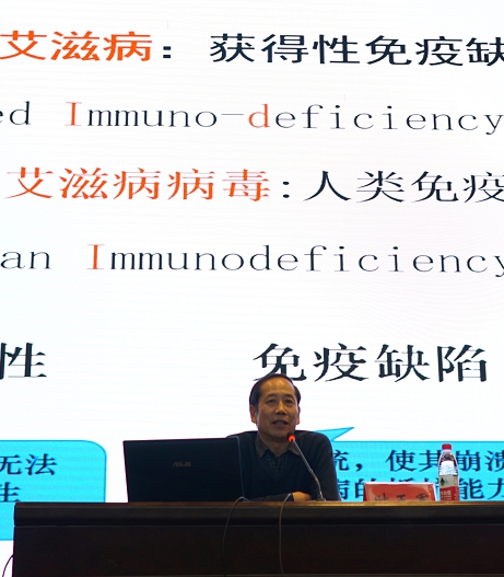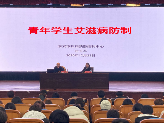 讲座由智能工程技术学院党总支书记蒋道霞主持,淮安市疾控中心性病艾滋病防治科科长时玉军受邀主讲。时玉军从艾滋病的病征、发病率,近年来全国、江苏省、淮安市增长的速度,如何防治艾滋病,如何避免感染艾滋病,被感染后如何采取措施等多方面多角度切入,深入浅出地为同学们讲解了艾滋病防治的相关知识。