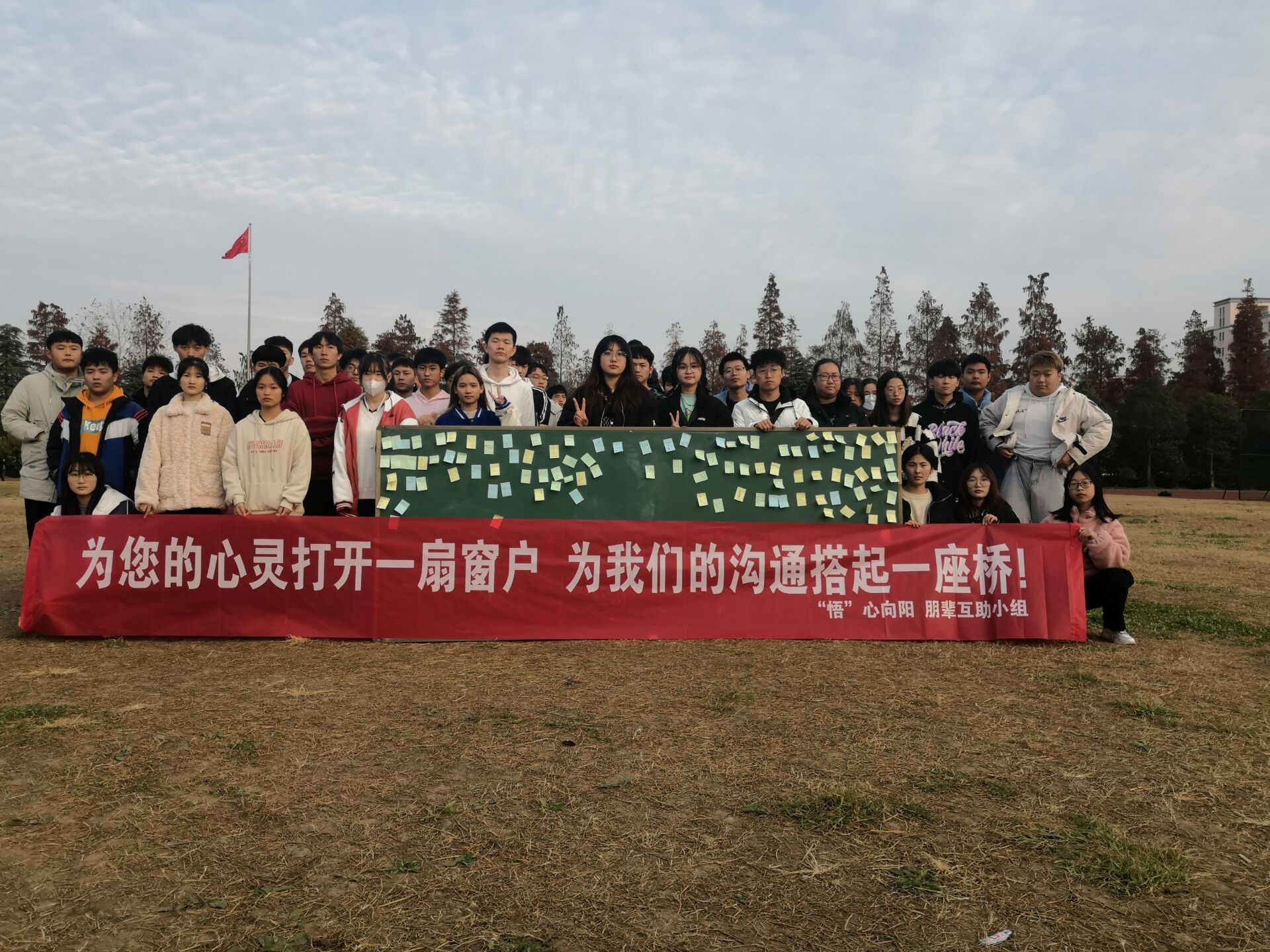 为了进一步提高大学生的心理素质,促进大学生的身心健康,传播温暖,拉进人与人之间的距离,帮助同学们发现身边的美好,智能工程技术学院“悟”心向阳、朋辈互助心理工作小组于2021年11月8日,在学校东操场举办“为您的心灵打开一扇窗户,为我们的沟通搭起一座桥”主题活动,学院心理辅导员陈华利老师、2021级各班心理委员、心理信息员及部分学生代表参与了此次活动。