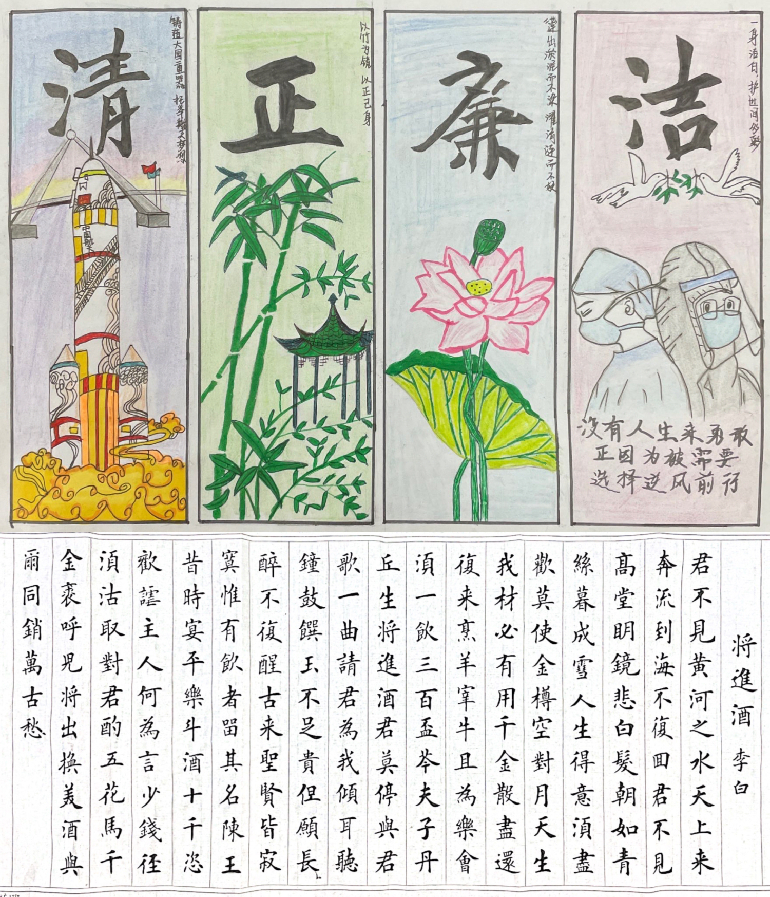 廉洁书画作品包括软笔书法、硬笔书法、书画和国画作品。廉洁作品以思廉、促廉、颂廉、扬廉为出发点和落脚点,通过廉洁作品创作、评比,教育引导学生学廉、思廉、爱廉、守廉,积极营造“以文养廉”的浓厚氛围。廉洁书画作品展示的是艺术境界,传递的是廉洁清风,宣扬的是对高尚精神风貌的追求。同学们积极参与到此项活动中,在一幅幅廉洁文化作品的创作过程中,廉洁二字深深地扎根于学生内心深处。活动共征集作品56幅,通过初评、终评,评选出一等奖3名,二等奖5名,三等奖8名。