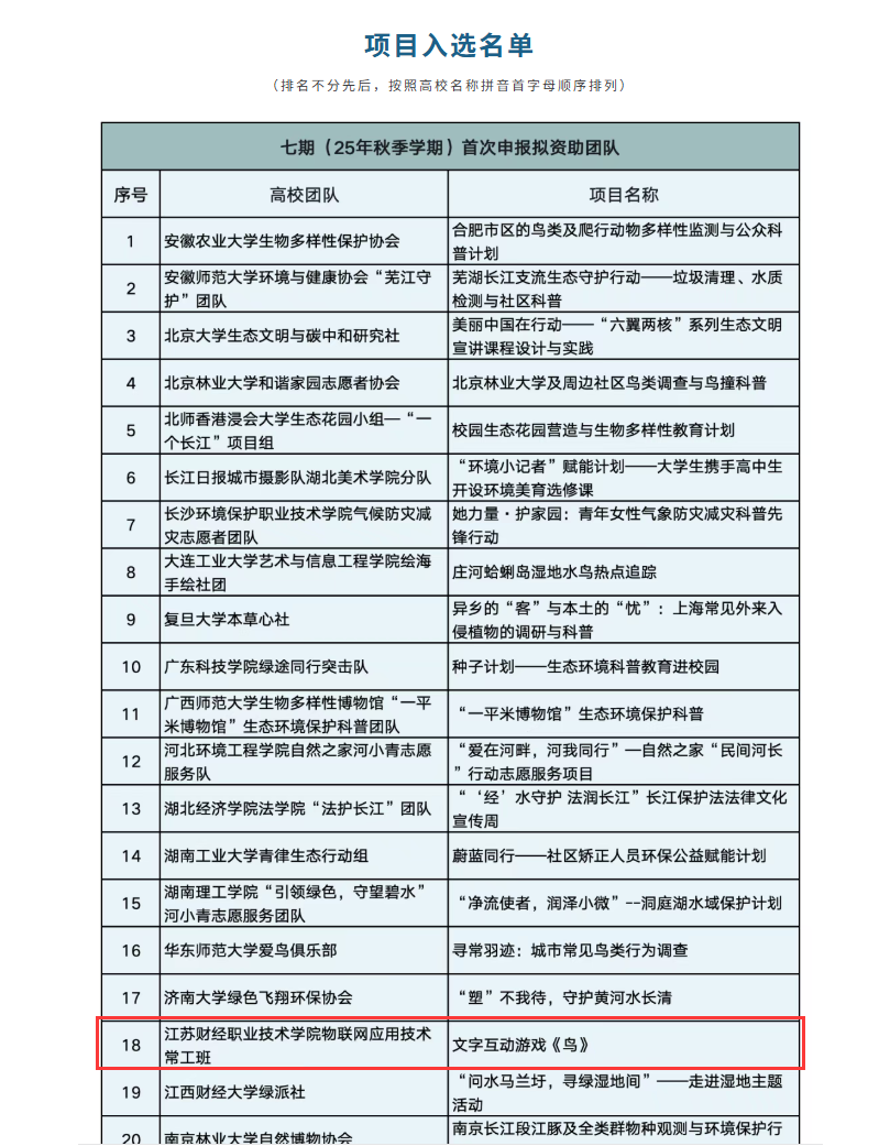近日,从“涓流行动——一个长江大学生环保活动资助计划”组委会获悉,我校智能工程技术学院25物联网(常工班)李雅珊等同学主持的环保公益项目:文字互动游戏《鸟》,经多轮评审,从全国27个省区72所高校的89个优秀项目中成功突围,荣获立项。该项目将获得由华泰公益基金会、南方基金慈善基金会等公益组织提供的2000元项目资助。此次项目立项,标志着我校学生项目在国家级跨学科公益实践平台上的首次亮相,充分展现了我校学子卓越的科创能力、公益情怀与综合素养。