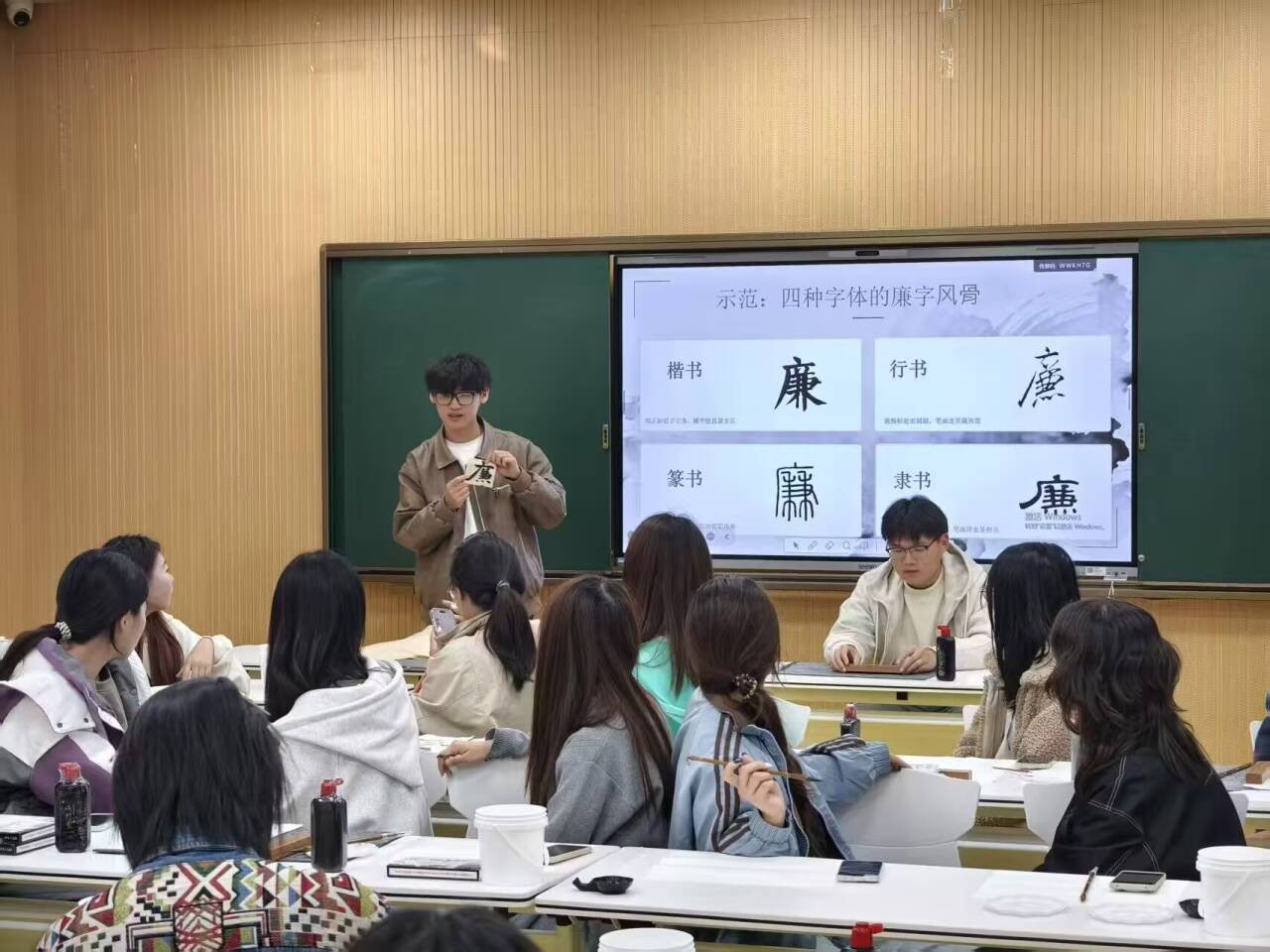 活动前期,学院学生干事细致筹备,完成场地布置及笔墨、绘画材料准备工作。活动通知一经发布,便得到各年级学生积极响应。现场特别邀请两位书法讲师,围绕“廉”文化内涵、书法书写技法展开讲解,并进行现场创作展示;活动分专业组与业余组同步开展,开场即营造出热烈氛围。