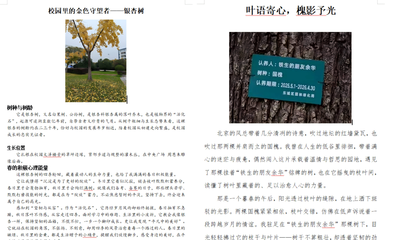 在“属于‘春’的约定”环节,活动更添温情与深意。同学们深入了解校园内各类树木的树种、树龄及背后的故事,分享自己与校园树木相伴的暖心瞬间。大家从树木默默生长、四季轮回的过程中感悟生命力量,并用文字记录与树木的美好联结,在草木生机中体会暖心润心的成长真谛。活动全程,同学们严格遵守“只拾不摘、文明环保”的原则,收集校园落叶开展创作,活动结束后还主动清理现场,用实际行动践行绿色环保理念。