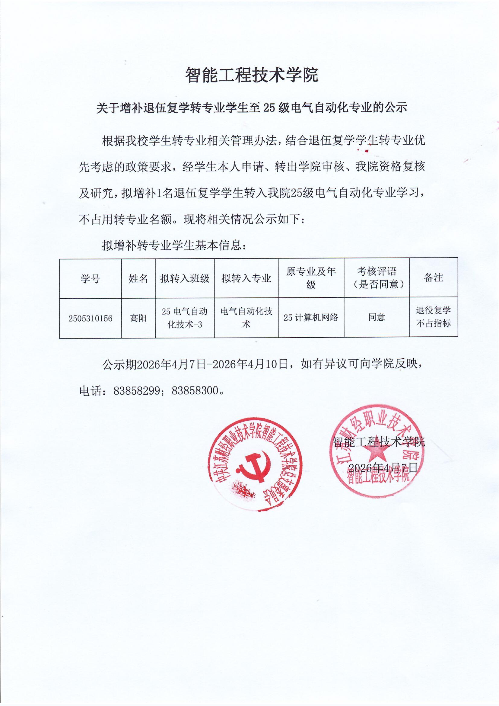 智能工程技术学院关于增补退伍复学转专业学生至25级电气自动化专业的公示